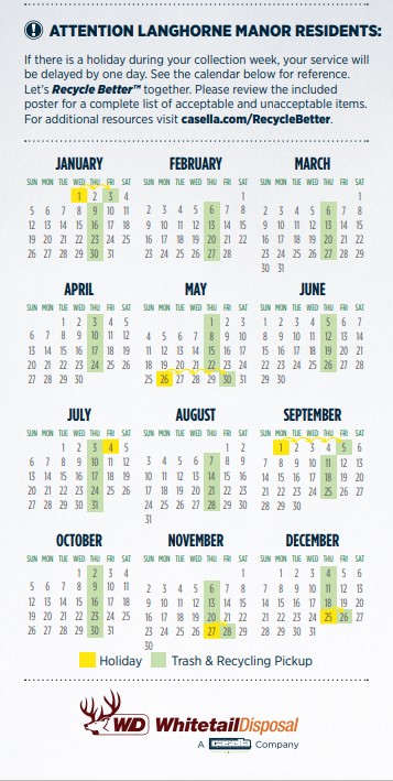 On Holiday weeks, trash pickup will be delayed one day and will occur on Friday. If you are unsure of the pickup day or would like any other information related to Trash, Recycling or Bulk Trash, please refer to the website for Whitetail Disposal at the following link: https://www.whitetaildisposal.com/municipality/langhorne-manor-borough/.
